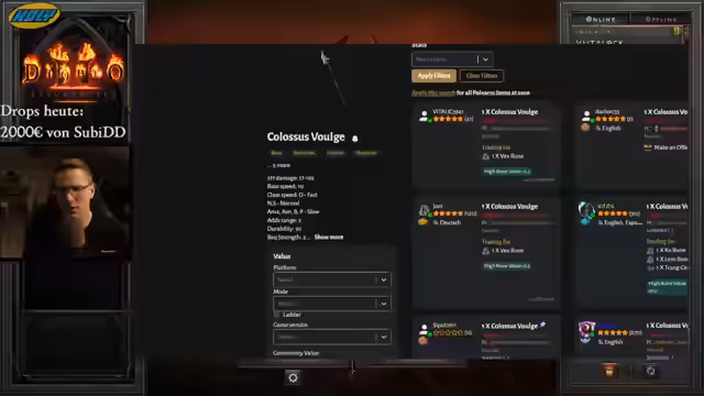 03:50:40Der Streamer testet aktiv die Trade-Plattform 'Traderie' für seinen Verkauf. Er ist unzufriedene mit der Funktionsweise der Preisumrechnung, da sie offenbar fehlerhaft ist und zwei Ist-Runen als wertmäßig geringer darstellt als sie tatsächlich sind. Trotzdem entscheidet er sich, seine ätherische Kolosswulge für zwei Ist-Runen einzustellen, was im Vergleich zum restlichen Markt ein Schnäppchen wäre. Er ist gespannt, ob die 'Schnäppchenjäger' der Plattform das Angebot annehmen und kommentiert, dass die Seite sehr tot wirkt, trotz hoher Nachfrage. In einem Nebenstrang versucht er erfolglos, einen Monarch-Schild zu handeln und bietet ihn stattdessen im Chat an.