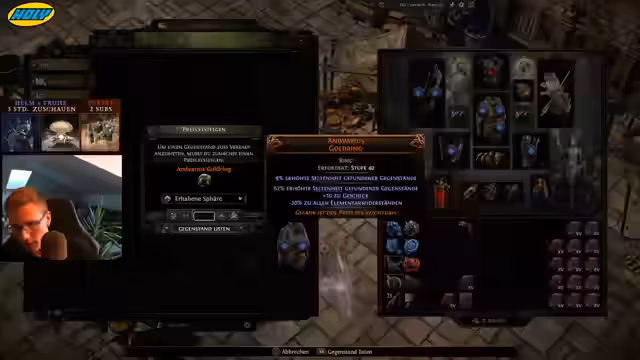 02:35:59Das Inventar ist schnell wieder voll, trotz Lootfilter, was das Craften von aufgenommenen Items direkt erforderlich macht, um Platz zu schaffen. Ein Rohr-Mount durch ein Level 14 Willegem wird als schade bezeichnet. Ein Ring mit T1 Chaos Resi und T1 Max Life, aber verringerten Attributsanforderungen, könnte dennoch wertvoll sein, wenn weitere gute Eigenschaften hinzukommen. Ein Amulett mit Triple T1 (Feuer, Blitz, Leben) wird als viel besser als die aktuelle Ausrüstung des Streamers bewertet. Durch einen Fehler wird ein Köcher zerstört, da ein Omen von einem vorherigen Bogen noch aktiv war. Trotzdem werden Abgrund-Maps als lohnenswert erachtet, auch wenn sie nur einen Doppelturm zeigen. Die Wichtigkeit von hohen T1-Mods auf Bögen wird hervorgehoben, wobei jedoch die erste Eigenschaft nicht unbedingt Feuer sein muss.