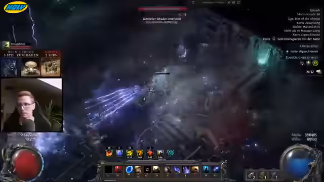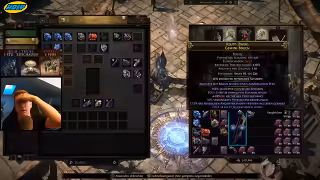 00:42:29Es wird festgestellt, dass deutsche Texte oft länger sind als englische, besonders bei YouTube-Titeln. Ein Bogen wird mit einer Essenz der Hass versehen, in der Hoffnung auf einen guten Roll. Es wird über das Omen der links gewundenen Nekromantie gesprochen und überlegt, das Omen des Echos zu nutzen. Es wird erklärt, dass ein guter Blitzschaden den DPS deutlich erhöhen würde. Es wird überlegt, ob es sich lohnen würde, das andere Omen noch mit dazu zu holen. Es wird das Omen des abgründigen Echos gekauft, um den Bogen zu verbessern. Es wird festgestellt, dass der Bogen ein höheres Eilevel hat, was die möglichen Tier-Rolls beeinflusst. Die hohe Gewichtung von Blitzschaden wird hervorgehoben. Es wird gehofft, einen Tier 3 oder Tier 2 Blitzschaden zu erzielen. Es wird die Kamera ausgeschaltet, um den Fokus auf das Spiel zu legen. Es wird ein Blitzschaden über 100 angestrebt. Das Gear ist schon reserviert und kommt mit auf den Friedhof. Es wird betont, dass man sich sein Gear nicht schenken lassen sollte, da dies den Spielspaß kaputt macht. Es werden Feuer und Kälte getroffen, obwohl Blitz wahrscheinlicher war. Das Omen wird genutzt, um neu zu rollen, in der Hoffnung auf Blitz. Es wird Fassungslosigkeit darüber ausgedrückt, dass die wahrscheinlichste Eigenschaft nicht getroffen wird. Es werden Exalted Orbs auf den Bogen gelegt, und es wird eine 4er Crit-Chance erzielt.