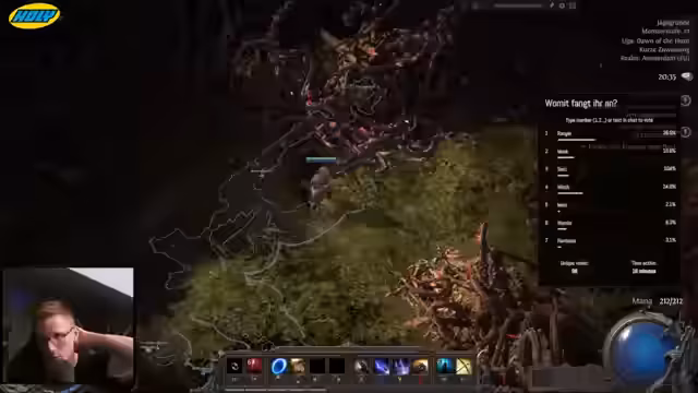 01:47:12Um die Community einzubinden, startet der Streamer einen Live-Poll, um die beliebteste Starterklasse für die anstehende Season zu ermitteln. Er bietet die sieben Grundklassen an: Ranger, Monk, Sorg, Witch, Mercenary, Warrior und Huntress. Die Ergebnisse werden mit denen aus einem Reddit-Poll verglichen, wo die Aszendenten gerankt wurden. Während bei Reddit Ranger und Deadye vorne lagen, führt hier der Ranger deutlich vor der Witch. Der Streamer fragt die Chat-Mitglieder, welche Variante der Witch sie spielen, um mehr Einblicke zu gewinnen.