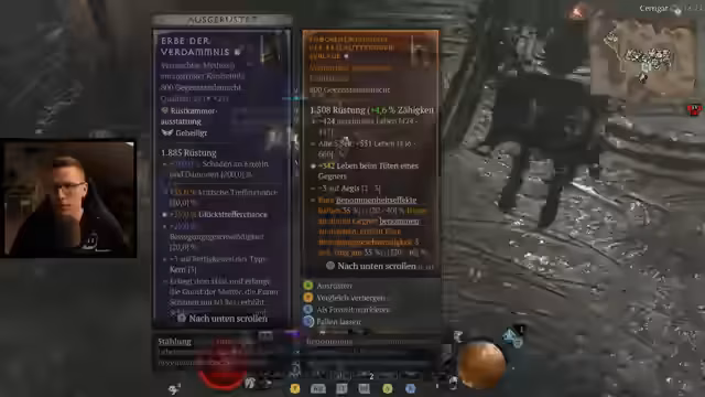 00:56:41Der Streamer heiligt und zerstört mythische Items, um Funken zu erhalten, ist aber von den Ergebnissen enttäuscht (z.B. schlechte Affix-Kombinationen). Für den Flügelschlag-Build optimiert er die Ausrüstung: Er diskutiert den Einsatz von 'Chris-Wolz'-Aspekten und Entscheidungen bei Handschuhen sowie Schilden. Dabei klärt er auch Unklarheiten bei der Spielmechanik: Das Amulett-Attribut 'Gebieter verursacht doppelten Schaden' bezieht sich laut ihm auf die Flügelschlag-Fähigkeit, nicht auf die Gebietergestalt, was auf Übersetzungsprobleme hinweist.