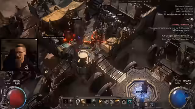 07:00:02Nach Item-Upgrades steigt der DPS von 450 auf über 766, besonders durch den Skillbaum-Knoten für Nahkampfschaden (20%). Der Akt-2-Boss wird als leichter für Nahkämpfer eingeschätzt. Für die Aszendenzprüfung wird die Schamane-Klasse mit Rausch-Mechaniken erwähnt, während Attribute wie Wille für Fähigkeiten wie 'Trinity' diskutiert werden. Der Boss 'Klamm der Verräterin' wird als nächstes Ziel genannt.
