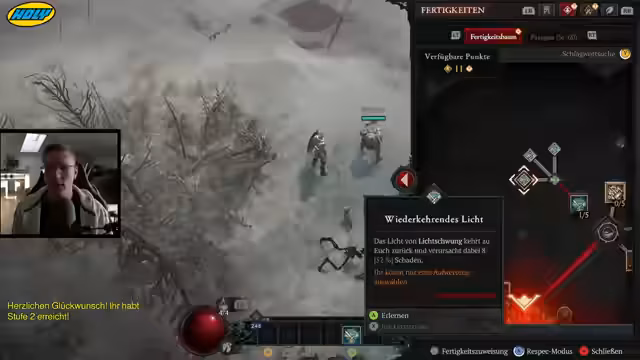 00:22:54Während des Levelns werden die Skillpunkte strategisch verteilt. Der Fokus liegt auf dem Schaden durch Heilige Licht Aura und dem gemaxten Hammer, da diese Kombination am Anfang den meisten Schaden erzeugt. Der Streamer erklärt seine Philosophie bei der Erstellung von Level-Guides: Sie beziehen sich nicht nur auf das frühe Spiel, sondern auf den gesamten Levelverlauf bis zum Endgame. Die heilige Blitz Aura wird als extrem effektiv zum Zermürben von Gegnern gepriesen und bleibt im Build, solange sie nützlich ist.