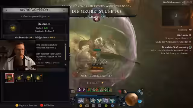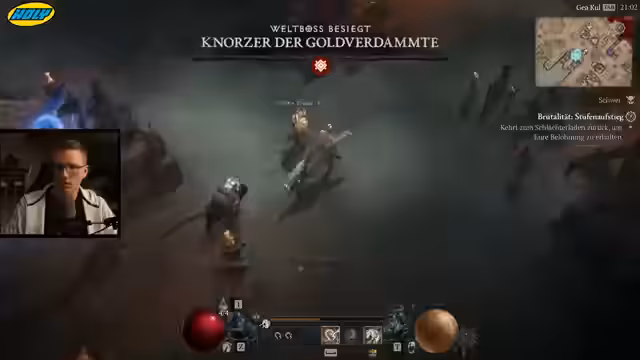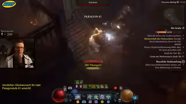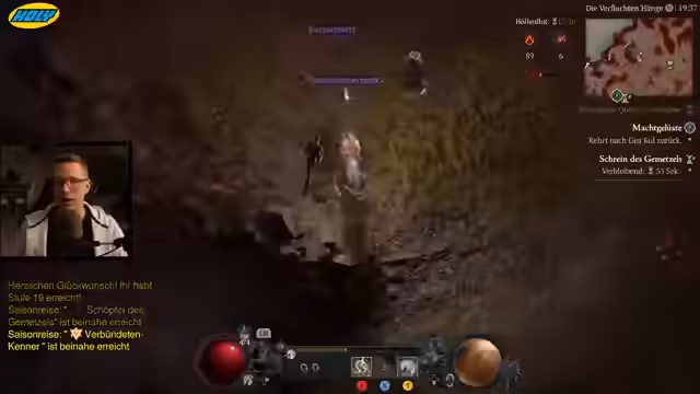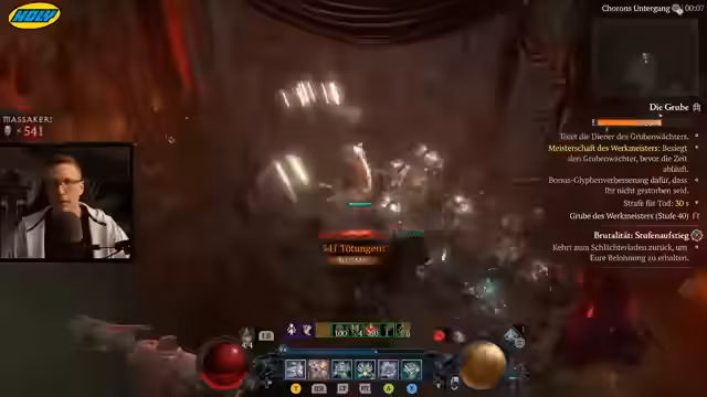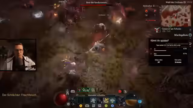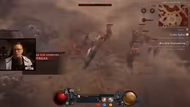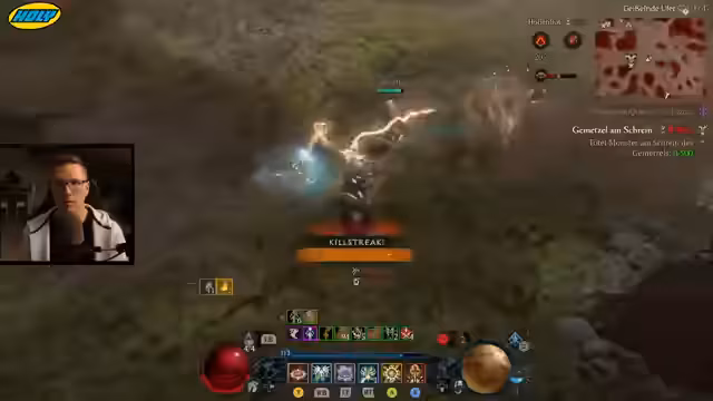 06:00:11Der Streamer stellt die effektivste Levelmethode für die Season vor: die Kombination aus Butcher-Events in der Helltide und Flüstergaben. Im 'Butcher Event' spawnen sehr viele Monster, was massiv XP bringt, und man kann durch 'grausige Gaben' zusätzliche Erfahrung sammeln. Der empfohlene Build ist ein 'Hammerdin', der mit 'Seraphs Flügel' und 'Fallender Stern' eine unendliche Kettenreaktion auslöst und sehr mobil ist.