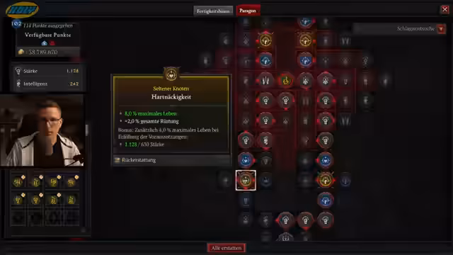 06:28:55Der Streamer konzentriert sich auf das Ausrüsten eines vollständigen Sets mit seltenen und legendären Items. Er experimentiert mit verschiedenen Aspekten, wie z.B. 'Gebieterabklingzeit', und analysiert die passiven Fähigkeiten wie 'Tugendhaft' und 'Bewegungstempo'. Die Prüfung von Runen für höhere Crit-Chance und die Optimierung des Builds stehen im Fokus, besonders bei der Suche nach passiven Verstärkungen.