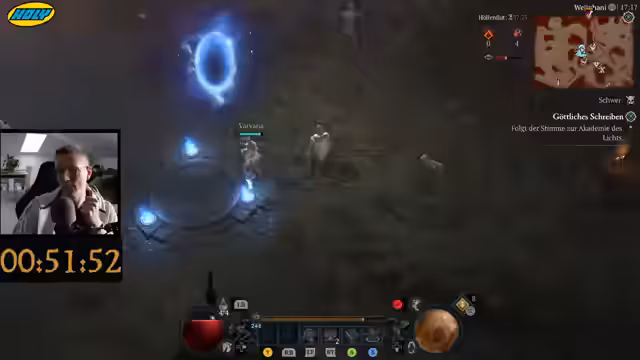 02:03:22Nachdem eine stabile Verbindung erreicht wird, geht es los mit dem Grinden. Der Streamer spielt einen Hybrid-Build mit Hammerdin und Flügelschlag. Eine Warnung im Chat deutet darauf hin, dass der Auradin-Build aktuell nicht spielbar ist, da eine wichtige Aura nicht korrekt funktioniert. Ein Bug bei der Wolf-Rune wird erwähnt. Trotz der anfänglichen technischen Probleme wird ein fester Plan für den Start in die Saison verfolgt und die ersten Level absolviert.