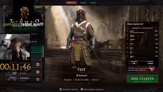 01:41:58Der Stream beginnt mit dem Start des Spiels auf dem neuesten Patch 2.6. Der Streamer wählt einen Paladin als Charakter und startet auf der Schwierigkeitsstufe 'Schwer'. Bereits kurz nach dem Start treten massive technische Probleme auf. Das Spiel stürzt ab und ein Rollback setzt den Charakter auf Level 1 zurück, was auch den Verlust von wichtigen Ausrüstungsstücken wie Schuhe mit Bewegungstempo bedeutet. Mehrmalige Neustarts und Warteschlangen führen zu Frustration, da keine stabilen Verbindung möglich ist.