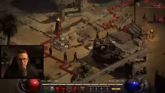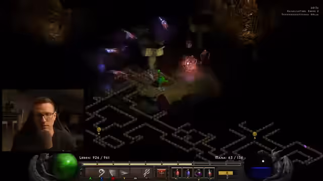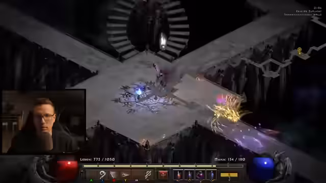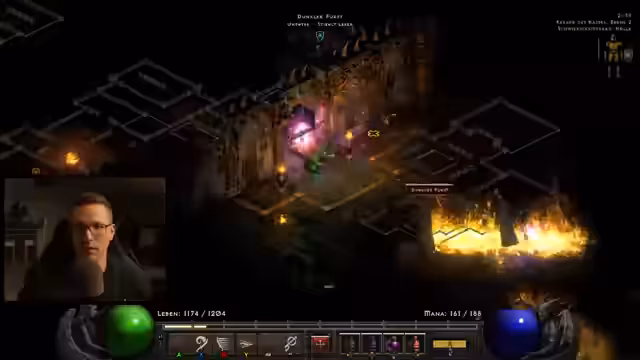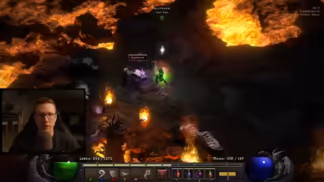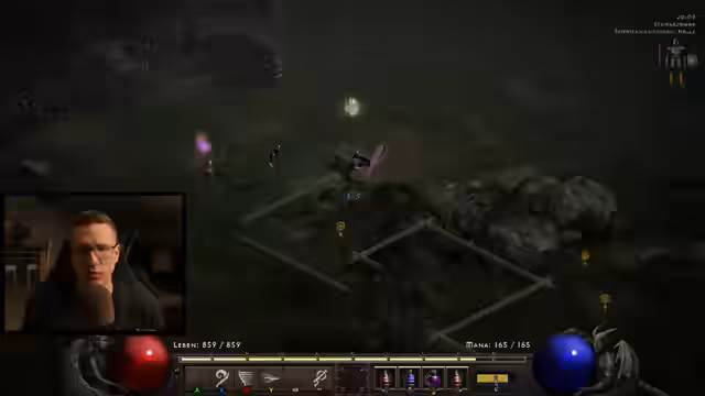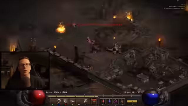 01:37:45Der Streamer erleidet einen tödlichen Angriff, als er von mehreren immunen Gegnern und mit Mana-Verbrennung umgeben ist. Er stirbt, nachdem er eine Wegstelle erkundet hat, was ihn dazu zwingt, das Spiel neu zu joinen. Der Wiedereinstieg ist jedoch unproblematisch, da er die bereits erkundete Region noch nicht vollständig verlassen hatte. Er konstatiert, dass Sterben in Diablo 2 zum Spiel gehört, besonders bei Solo-Spielen, und dass es wichtig ist, mit solchen Situationen umzugehen.