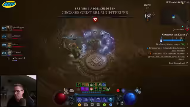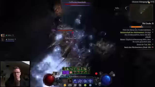 01:59:18Es wird über Probleme mit der Defensive trotz Max Resi diskutiert und vermutet, dass fehlendes Maxlife auf beiden Ringen der Hauptgrund dafür ist. Beim Druide ist das Leben wichtig. Es wird überlegt, dass die Ringe das Problem sind. Es wird der Kompass gestartet. Es wird die ganze Zeit Blizzard statt Kugelblitz gedrückt. Es wird überlegt, dass wenn man Licht anmacht, muss man die Beleuchtung ändern. Es wird gehofft, dass die Ätherfürsten kommen. Es wird erklärt, dass man tatsächlich mit Mana Schild sterben kann, wenn man Kugelblitz spielt, weil er so viel Mana Drain hat und weil das Mana dann auch wieder sinkt. Je mehr Chaos Rüstung, desto weniger Mana. Es wird festgestellt, dass Kataklysmus nicht dauerhaft nutzbar ist. Ederscheusale, Königstadt, Elitegegner sind die drei wichtigsten Sachen.