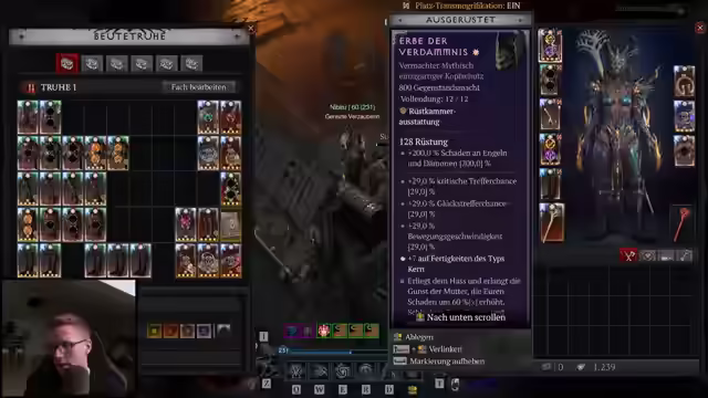 04:24:34Zunächst werden unbrauchbare Items aussortiert, um Platz im Inventar zu schaffen. Die Suche nach einem geeigneten Zweihandstab gestaltet sich schwierig, da kein passender mit den erforderlichen Attributen vorhanden ist. Ein temporärer Stab wird als Platzhalter ausgewählt, in der Hoffnung, später einen besseren zu finden. Die Handschuhe des Erleuchters, ein Amulett(von einem Zuschauer ertradet) und andere Ausrüstungsgegenstände werden angelegt. Es wird ein Bounty Board geöffnet, um möglicherweise einen besseren Stab zu erhalten, und ein Blick in den Unterschlupf wird empfohlen. Die Todesfalle funktioniert nicht mehr wie zuvor, die Ressourcengewinnung erfolgt nun über andere Methoden, insbesondere durch das Härtungsrezept, das Ressourcen bei Verwendung einer ultimativen Fertigkeit gewährt. Die Ressourcenerzeugung ist kompliziert, da der Chaos-Vorteil vorübergehend deaktiviert ist, aber bald wieder funktionieren soll. Die Schwierigkeit, Items mit Maus zu looten, wird angesprochen, wobei der Controller als komfortablere Alternative dargestellt wird. Es wird erwähnt, dass der Stab des endlosen Zorns selten ist, aber in der aktuellen Chaosrüstung enthalten ist und drei Feuerball statt zwei hat, was ihn besser als den vorherigen macht.