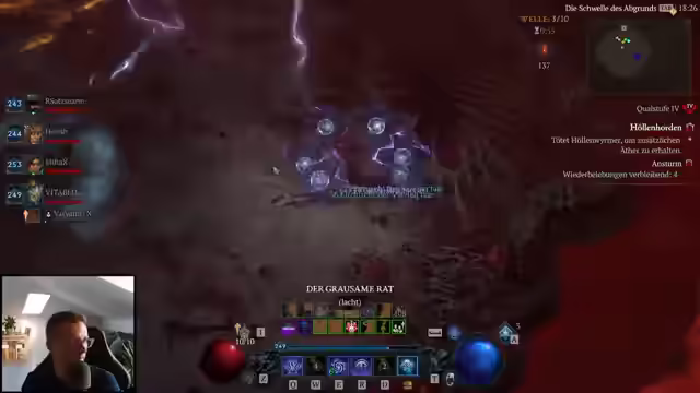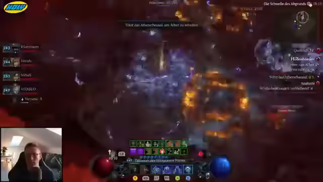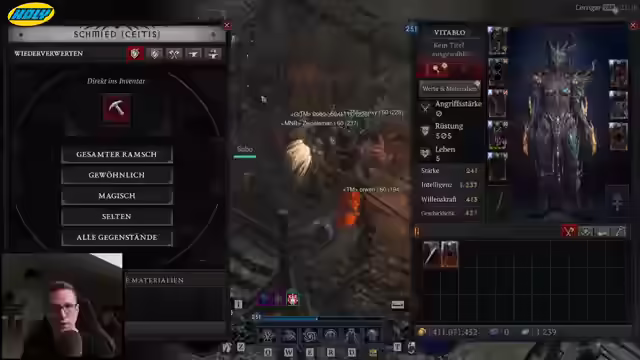 02:44:04Es werden Seelen mitgenommen, da nur 700 vorhanden sind und ein paar Legion-Events gemacht werden sollen. Das Gold beträgt 360 Millionen, was gut ist und schnell steigt. Die Arena macht richtig Bock durch den neuen Bild und es gab relativ viel Äther heute. Die Arena läuft schon über eine Stunde. Es wird ein Legion Event in der Hölle gemacht. Es wird erklärt, dass es egal ist, ob man einen Zauberstab oder ein Schwert nimmt. Es wird erklärt, dass es nur dann nicht egal wäre, wenn es ein Limit von Kugelblitzen gibt, das man erreichen kann. Es gibt ein Limit und zwar bei 20 Kugelblitze. Es wird festgestellt, dass ein Streitkolben besser ist. Es wird ein Streitkolben ausgerüstet.