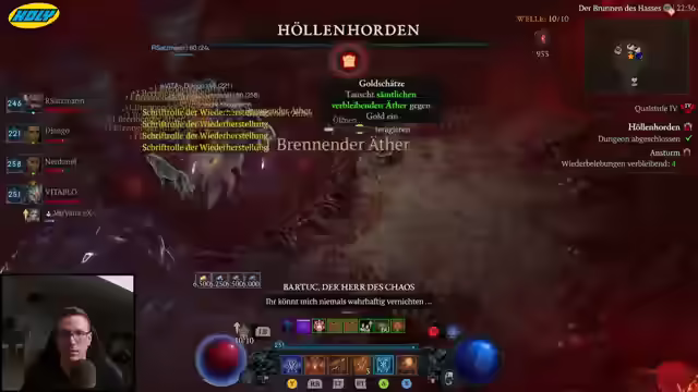 01:45:46Es wird nach dem Stab des endlosen Zorns gesucht, aber das GA ist auf der nutzlosesten Eigenschaft von 4. Es wird überlegt, ob man Überwältigung testen soll. Es wird überlegt, ob heute wieder Legion-Events mitgemacht werden sollen, da nur 700 Seelen vorhanden sind. Vergessene Seelen werden beim Vollenden benötigt. Im Discord wurde ein D4-Trophäenraum entdeckt, in dem ein Nutzer 6814 Äther gepostet hat. Seelen gibt es in der Legion. Da gibt es 200 Seelen für eine Legion. Es wird überlegt, ob man auf Seelentürme gehen soll. Die Entwickler wussten doch, dass wir alle Seelentürme hassen. Heute war ein Reddit-Topic, das hieß einfach nur remove soulspires. 600 Upvotes. Und jeder der Top-Kommentare unter dem Topic war einfach nur remove soulspires.