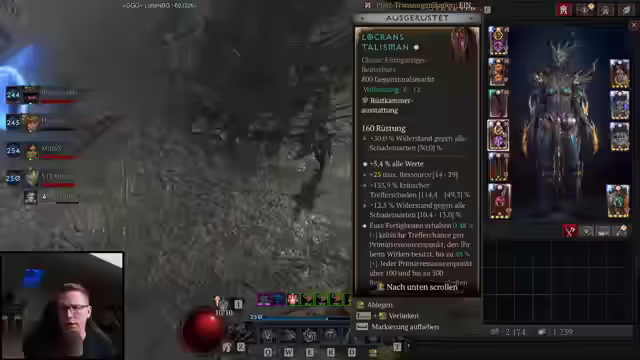 03:34:49Die Paragon-Tafel wird zurückgesetzt und der alte Build wird wieder ausgerüstet, um den Schaden erneut zu vergleichen. Es wird festgestellt, dass der Schaden identisch ist, was die Frage aufwirft, warum der 'Lokrans Talisman' zuvor einen so großen Unterschied gemacht hat. Es wird spekuliert, dass es möglicherweise einen Unterschied zwischen der Formulierung von 'Skill-Damage' und den spezifischen Bedingungen des 'Lokrans Talismans' gibt. Die Funktionsweise von 'Kommenden Blitzen' und 'Schockwellen' wird analysiert, um die Schadensmechaniken besser zu verstehen. Es wird festgestellt, dass die Schockwellen hauptsächlich zum Clear der Grube dienen, während ein bestimmter Effekt in Kombination mit der Tafel den Boss-Damage verursacht. Es wird betont, dass die Tafel funktioniert, was beruhigend ist. Abschließend wird festgestellt, dass der 'Lokrans Talisman' schwer zu testen ist, da die Schadenszahlen stark schwanken. Es wird ein Unterschied in der Formulierung zwischen der Tafel und dem Talisman hervorgehoben, wobei der Talisman sich auf 'Wirken' bezieht, was bedeuten könnte, dass nur selbst gewirkte Fertigkeiten zählen.