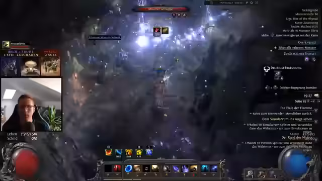 03:01:03Der Stream konzentrierte sich auf das Leveln bis Level 95 und das Farmen von gereinigten Karten, um Währungen wie Divine Orbs zu farmen. Nach den Erfahrungen von Streamer wird Delirium für Builds ohne Energieschild als ineffektiv bewertet, da Monster überleben und mehr Blitzeinsatz erfordern, was gefährlich ist. Zwei Tode wurden erwähnt, einer durch Delirium und einer am Anfang des Streams in einer Map ohne Riss.