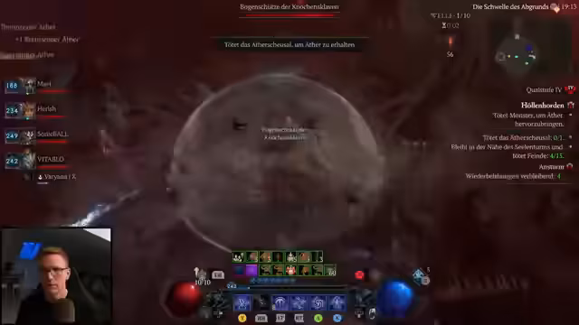 00:32:04Eine zentrale Strategie im Stream ist das gezielte Farmen von Äther. Der Streamer erklärt die Wichtigkeit des Unique-Tributs des Aufstiegs, der durch das Besiegen von Ätherfürsten, Ätherscheusalen und Scheusahle erhalten wird. Er betont, dass man eine Taktik konsequent durchziehen sollte, um maximale Äther-Einnahmen zu erzielen. Anstatt einer schlechten Taktik wie der Höllenblüter, ist die Kombination aus Seelentürmen und Ätherfürsten am effektivsten. Zudem soll im Chat kommuniziert werden, wenn der Tribut vorhanden ist, um eine erfolgreiche Gruppe zu bilden.