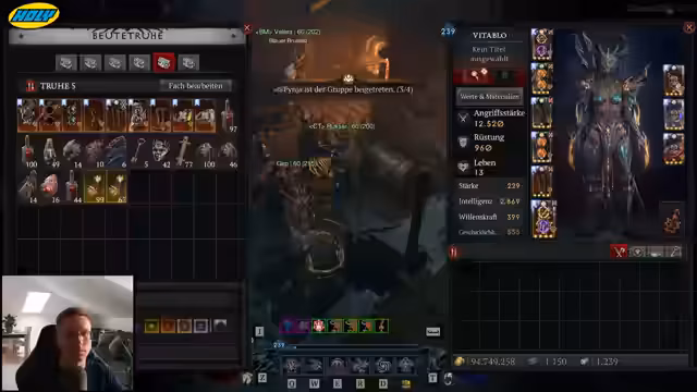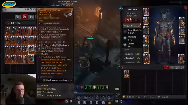 01:25:50Ein Zuschauer fragt nach der Funktionsweise der Chaosrüstung, da ein Gegenstand an einer ungewöhnlichen Stelle erscheint, wie ein Ring an den Stiefeln. Der Streamer erklärt, dass das das Grundkonzept der Chaosrüstung ist: Items können für jeden beliebigen Ausrüstungsplatz droppe. Da das nächste Legion-Event in Kürze beginnt, wird der Fokus auf das Farmen von vergessenen Seelen gelegt, die für verschiedene Builds benötigt werden. Die Gruppe wird vorbereitet, um das Event effizient zu absolvieren.