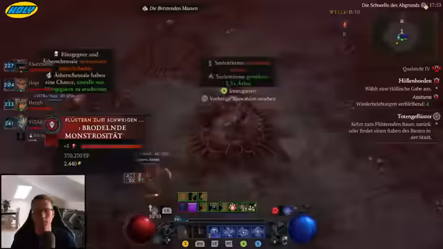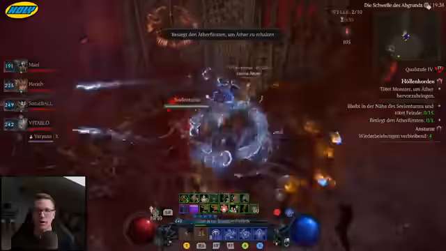01:51:26Der Streamer plant, nach dem Kompass eine Grube für grausige Gaben zu machen, um danach wieder in das Legion-Event einzusteigen. Parallel dazu wird ein Run mit Seelentürmen durchgeführt, bei dem das Ziel ist, so viele ätherische Massen wie möglich zu eliminieren, um den Effekt der Seelentürme zu maximieren. Es wird ein perfekter Seelenturm-Run angestrebt, bei dem mehrere Türme gleichzeitig erscheinen, um den Äther-Drop zu erhöhen. Eine Feuerballzauberin wird getestet, um eventuell eine 100er Grube zu schaffen.
