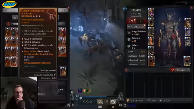 00:56:59Ein Highlight des Streams ist der Fund eines extrem wertvollen Gegenstands. Der Streamer erhält ein galvanisches Azurit mit den zwei besten möglichen Eigenschaften: Kernkompetenz und Angriffsgeschwindigkeit. Da dieser Gegenstand ideal für den geplanten Kugelblitz-Build ist, beschließt er, spontan den Build ohne eine mythische Rüstung zu spielen und stattdessen dieses neue Item zu nutzen. Dies ist ein massiver Fortschritt für sein Projekt und demonstriert das Potenzial der Chaosrüstung.