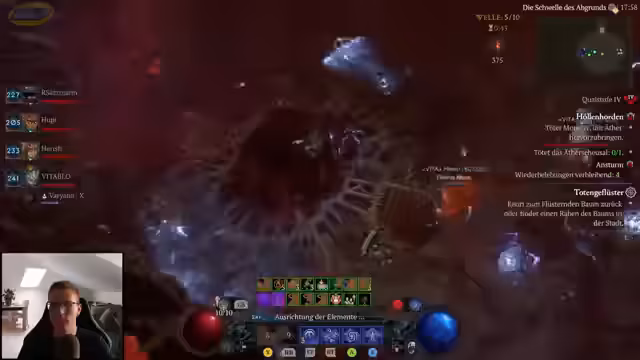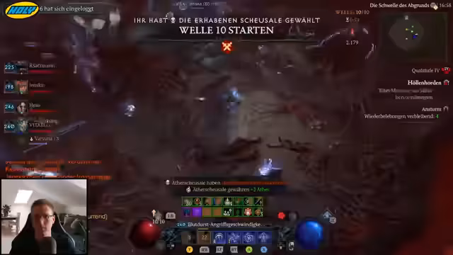 05:45:11Der Streamer versucht, eine durchgehende Taktik für die Äther-Events umzusetzen, was aber häufig scheitert. Die Gruppe wählt oft ungünstige Wellen wie die Chaoswelle, die weniger Äther gibt, oder verpasst legendäre Knoten, die die Effektivität massiv steigern würden. Auch die Legion Events werden aus Zeitgründen manchmal übersprungen, um stattdessen in der Arena weiter zu farmen. Trotzdem werden die Events als Abwechslung genutzt, bei denen auch seltene Items wie der galvanische Azurit gedroppt werden könnten.