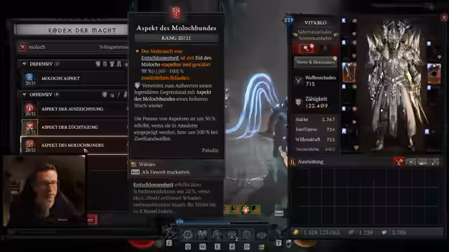 03:42:08Der Streamer analysiert die Aspekte für den Juggernaut-Build. Er findet den Moloch-Aspekt sehr stark, der Bossen und Gegnern mit Kontrollverlust erhöhten Schaden zufügt. Er ist unsicher bezüglich der deutschen Formulierung eines Aspekts, vermutet aber, dass dieser Schadensboni bietet. Er beginnt, den Build mit diesen starken Aspekten aufzubauen.