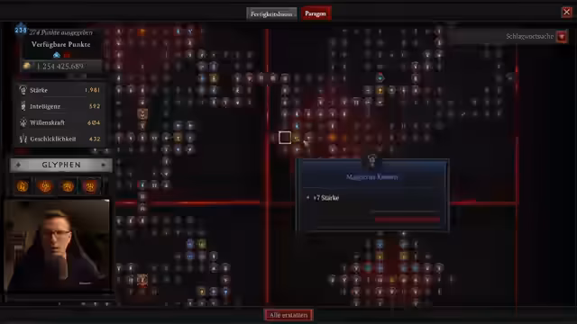 04:09:36Der Streamer experimentiert mit verschiedenen Runen für Frost-Effekte. Eine TAM-Rune wird in Betracht gezogen, da sie Gegner einfriert und 15% Lucky Hit bietet. Allerdings wird dadurch Perma-Evade geopfert. Der Streamer entscheidet sich für einen Nordwache-Aspekt zum Einfrieren von Gegnern. Er erwähnt auch die Möglichkeit der Tool-Rune für Einfrieren und stellt fest, dass Freeze ein guter Kontrollverlust-Effekt ist. Die Schild-Heap-Glyphe wird als wichtig identifiziert, um die Größe des Schilds zu erhöhen.