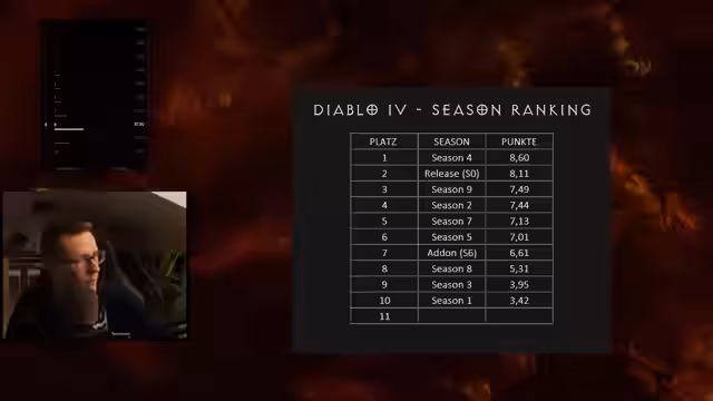 02:18:45Season 7 brachte erhebliche Änderungen am Spielgefühl, beginnend mit der Behebung der Spiritborn-Bugs aus Season 6. Ohne diese Bugs war die Grube jedoch zu schwer, was in Season 7 durch eine Neuskalierung behoben wurde. Dies machte Season 7 zur schnellsten Season, um Hundertergruben zu farmen, und ermöglichte auch Gelegenheitsspielern, weit voranzukommen. Builds wie Pfeilhagel-Jägerin, Wirbelwind-Erdbeben und Schattenwelle-Nekro konnten hohe Grubenlevel in Rekordzeit bewältigen. Ein weiteres Highlight war die Einführung der Rüstkammer, die es Spielern ermöglichte, mehrere Builds pro Klasse zu speichern und zu wechseln, was für den Streamer als Build-Bauer von großem Vorteil war. Die Hexenmächte, obwohl grafisch ansprechend, wurden als enttäuschend empfunden, da die beschworenen Diener zu schwach waren und Spieler letztendlich nur die Schadenshebel nutzten. Okkulte Edelsteine, recycelte Herzen aus Season 1, trugen ebenfalls zum Gesamtpaket bei, wurden aber als langweilig empfunden. Obwohl die Season schnell durchgespielt war und auf Twitch wenig Zuschauer hatte, war sie bei vielen Spielern beliebt, da man mit wenig Spielzeit viel erreichen konnte. Der Streamer vergibt eine 7, was Season 7 auf das Niveau von Season 5 hebt, während die Community mit 7,25 eine etwas höhere Wertung vergibt, was zu einem siebten Platz im Gesamtranking führt.