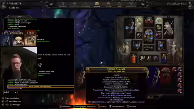 02:01:14Ein Bogen mit +5 und weniger TPS wird mit einem +4 Bogen mit mehr TPS verglichen, wobei die DPS-Differenz von 50 als entscheidend angesehen wird. Es wird vermutet, dass der Bogen mit 5 CPS besser ist, aber die endgültige Entscheidung hängt vom Gesamtdamage ab. Das Aussehen des Charakters mit den Elfenflügeln wird gelobt, wobei das Roa und das Hideout als nicht passend empfunden werden. Der Portal-Effekt des Rostkönigs wird als unpassend empfunden und der vorherige Effekt wiederhergestellt. Es wird angekündigt, dass Maus- und Controller-Wechsel erst ab der nächsten Season flüssig möglich sein werden. FPS-Einbrüche werden festgestellt, möglicherweise aufgrund eines Treiberupdates oder der Engelsflügel. Ein Zuschauer weist darauf hin, dass die Maps nicht im Map-Stash gelandet sind, da die Zuweisung im Gildenstash deaktiviert ist. Es wird eine Möglichkeit für mehr Currency im Turm mit Delirium-Tablets erwähnt. Es wird festgestellt, dass ein Bogen mit 149 physisch und T1 Flat physisch kein guter Bogen ist, da es sich um einen Hybrid aus zwei Eigenschaften handelt.
