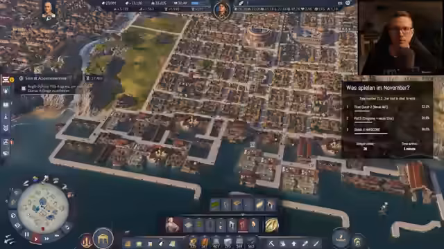 00:43:26Der Streamer informiert über laufende Anno-Drops, die bis zum 24. November aktiv sind. Er bemerkt, dass Amphoren, ein wichtiges Produkt, zu schnell verbraucht werden und plant, zwei Schiffe für den Transport zu beladen. Ein Problem mit einer Handelsroute für Lehm wird behoben, da das Schiff versehentlich aus der Route genommen wurde. Er sucht weiterhin nach einem Spiel für den November und fragt die Zuschauer nach Vorschlägen. Neben Titan Quest 2, PoE 2 und Diablo 4 Hardcore werden Spiele wie Elder Scrolls Online, Bioshock (das dem Streamer nicht zusagte), Witcher 3 (bereits ausgeschlossen für den Stream), Dota 2, Battlefield 6 (das er bereits offstream spielt), Sacred 2 Remaster (nicht ansprechend genug), Sims und Plague Tale genannt. Der Streamer erwähnt, dass seine Hände sich erholt haben und er wieder Shooter spielen kann, was früher aufgrund des dauerhaften Drückens der W-Taste problematisch war. Er stellt fest, dass er das Baulimit für Schreine auf der Insel erreicht hat und keine weiteren platzieren kann. Die Diskussion über Spielvorschläge und die Verbesserung der Handelsrouten zeigt die Vielseitigkeit des Streams und die Interaktion mit der Community.
