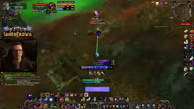 03:51:17Ein anderer Spieler, der ebenfalls auf neutrale Timbermaw-Reputation farmt, schließt sich dem Streamer an. Gemeinsam clearen sie ein Camp voller gefährlicher Gegner, darunter Rächer, Schamanen und Höllenhüter, und meistern die Kämpfe trotz der komplexen Mechaniken, bei denen Rächer in Rage geraten, wenn ein Kamerad stirbt. Der Streamer erklärt die Notwendigkeit, zuerst die Rächer zu eliminieren. Anschließend wird ein Boss besiegt, der 25 Rufpunkte bringt. Der Drop, eine 'Schluchttasche', wird als selten und wertvoll für Schneider angesehen.