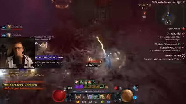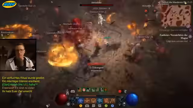 03:21:15Der Hauptfokus liegt auf dem schnellstmöglichen Leveln der Zauberin durch die Helltide. Er nutzt die hohen Kill-Zahlen und die 1000er-Kill-Boni, um massenhaft Erfahrungspunkte zu sammeln. Die Strategie ist erfolgreich und die Zauberin steigt sehr schnell in den Leveln auf. Dabei muss er darauf achten, seine Killstreak nicht durch einen Tod zu verlieren.