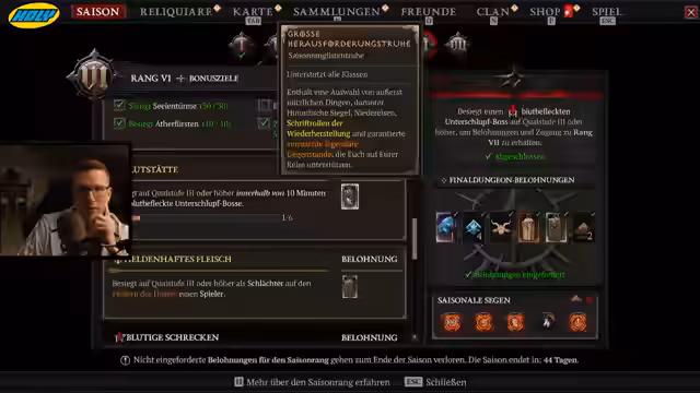 02:19:10Der Fokus liegt auf der Erfüllung der Saisonreise-Aufgaben. Besonders das Sammeln von Blutbefleckten Uniquen steht im Vordergrund. Er erklärt, dass diese Items vor allem an den Superbossen im T100-Siegel-Modus droppen, was die strategische Jagd auf diese Gegner erfordert. Ziel ist es, die 31 benötigten Items schnellstmöglich zu farmen, um die Belohnungen der Saisonreise freizuschalten.