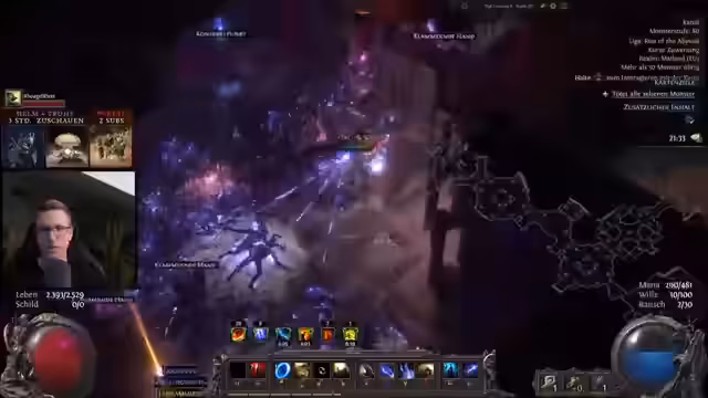 02:56:50Der Streamer erklärt die Komplexität des Skill-Systems, speziell bei Blitzwerf, das durch verschiedene Gegenstände und Amulette aufgerüstet werden kann. Er merkt an, dass er Level 96 ist aber noch keine Level-20-Gems gesammelt hat, was einen spürbaren Schaden bedeutet. Er diskutiert auch die Mana-Probleme und wie diese durch bestimmte Skills wie Wanderer der Wildnis und Mana Leech auf Gegenständen gelöst werden können.