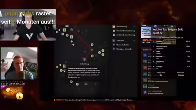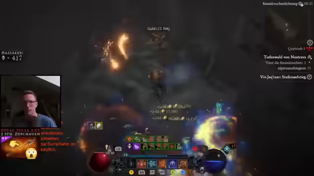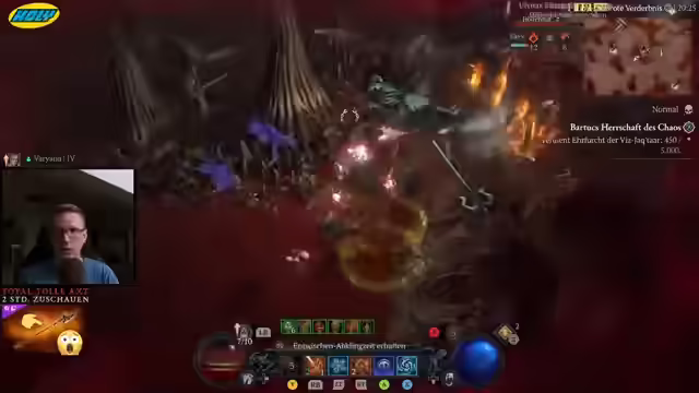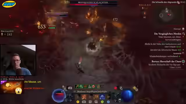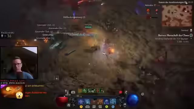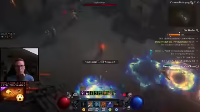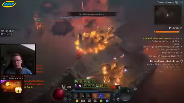 03:08:11Chaosportale können schwer sein, was für Hardcore-Spieler wichtig ist. Es wird festgestellt, dass man im Tribut nicht umskillen kann. Der Hydra-Build wird gespielt, aber ohne den Guide offen zu haben. Der Unterschied zum Guide wird analysiert und Inferno wird statt Kugel reingenommen. Sobald explosive Kombinationen vorhanden sind, soll Flammschild durch eine Basis-Attacke ersetzt werden, was dem Guide entspricht. Die Zuschauerzahl ist so hoch, dass mehr Leute zuschauen als Deutschland Einwohner hat. Flüstergaben werden entgegengenommen, vor allem Stiefel mit Bewegungstempo. Es wird bestätigt, dass Siegel mit grausigen Gaben-Symbolen funktionieren. Blutwoge wird als Lieblings-Nekro-Level-Build genannt. Die hohe Zuschauerzahl wird als Rekord und Zeichen für den gelungenen Season-Start gewertet. Der Streamer ist Platz 1 in der deutschsprachigen Diablo-Kategorie. Season 10 wird als großer Schritt in die richtige Richtung gelobt und die Chaosmächte werden als geile Idee gelobt. Viele Zuschauer geben an, wegen der Chaos-Rüstung wieder in die Season einzusteigen. Es wird bedauert, dass dies die erste Season mit einem richtigen Season-Thema ist. Ein Weltboss in 51 Minuten wird anvisiert. Höllenhorde soll sich auch beim Leveln lohnen und wird nach dem Stützpunkt getestet. Vorhandene Siegel können nachträglich Symbole erhalten, daher sollte man sein Siegelinventar regelmäßig überprüfen.