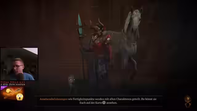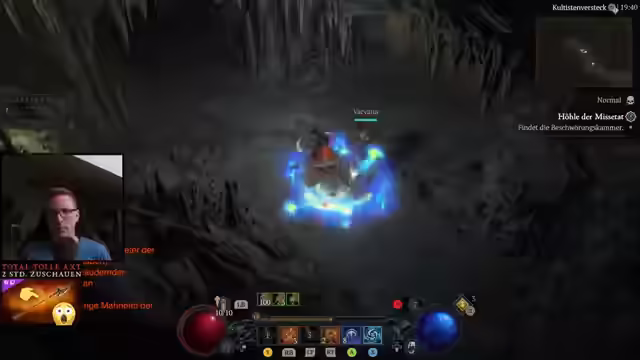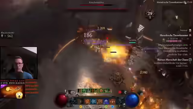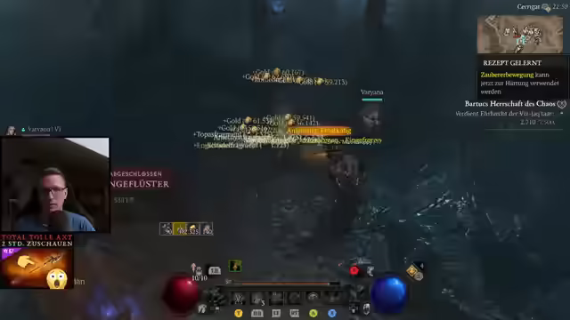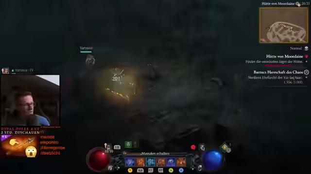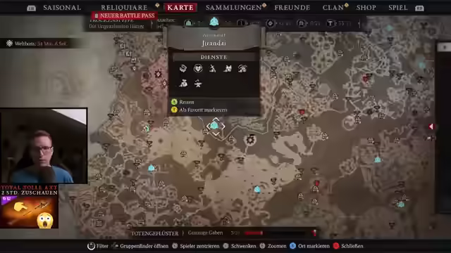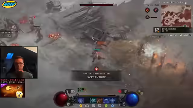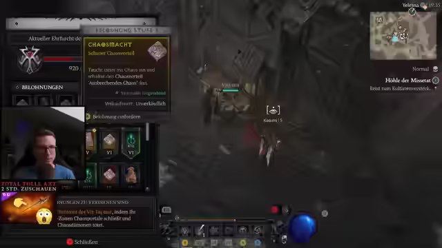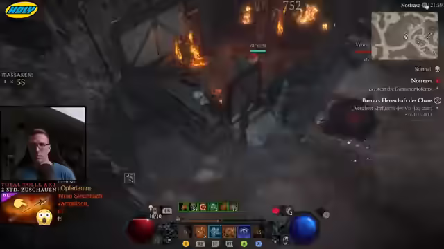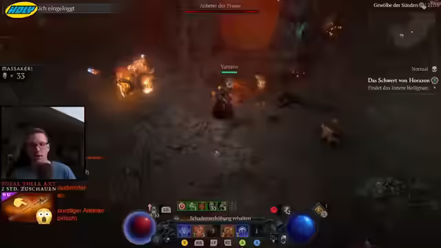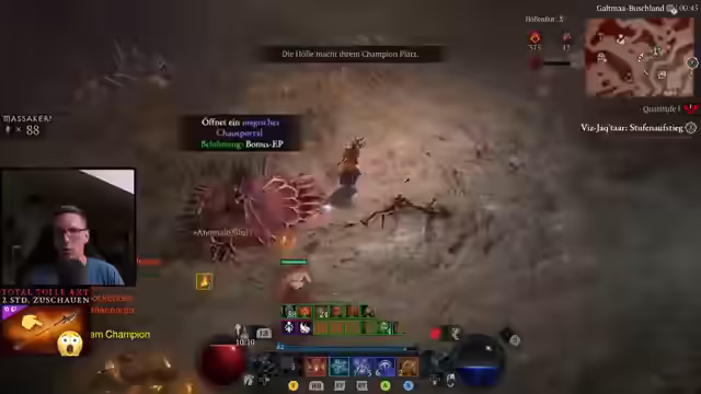 04:58:26Es geht voran, Level 60 ist das nächste Ziel, um richtig durchzustarten. Der Hydra-Aspekt fehlt noch, obwohl die Lum-Rune schon vorhanden ist. Das Farmen von 75 Kultisten für grausige Gaben gestaltet sich schwieriger als erwartet. Die Funktionsweise von Twitch-Drops wird erläutert: Blizzard-Account mit Twitch verbinden, zwei Stunden Stream schauen und Drops auf Twitch abholen, die dann im Spiel erscheinen. Nach dem Verbinden von Blizzard und Twitch wird der Fortschritt beim Zuschauen getrackt. Ein roter Balken signalisiert, wenn genug Loot für eine Truhe vorhanden ist. Chaos-Portale werden für die Saisonreise genutzt. Es wird gehofft, dass die Anzahl der benötigten Portale in späteren Etappen nicht zu stark ansteigt.