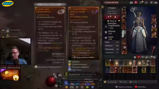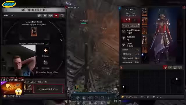 08:09:46Es wird Frustration über das Ausbleiben von Höllenblütern geäußert, trotz mehrerer Erweiterungen, die deren Erscheinen fördern sollten. Der Aether kommt hauptsächlich durch den Butcher und Ätherfürsten, nicht durch die erwarteten Höllenblüter. Ein Bug wird vermutet. Trotzdem gelingt es, Bartok zu beschwören. Der Streamer erhält Mana-Schild, was die vorherige Frustration vergessen lässt. Es folgt der Plan, auf Combo-Blitze umzuskillen, wobei der Hydra-Build gespeichert wird, falls der neue Build scheitert. Neue Items mit Intelligenz werden gesammelt, wobei das Härten der alten Items ein Problem darstellt. Ein Besuch bei den Söldnern soll helfen, fehlende Items zu finden. Handschuhe mit GA-Intelligenz werden gefunden, obwohl die anderen Eigenschaften unpassend sind. Das Amulett vom Hydra-Build wird vorerst weiterverwendet. Der Stab von Lammesen wird ausgerüstet und der Combo-Blitzer-Aspekt hinzugefügt.