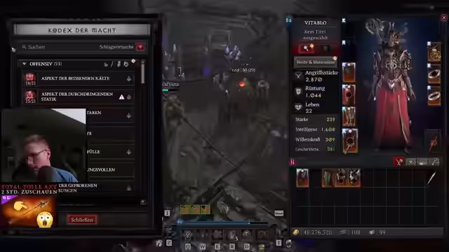 05:51:01Level 60 wurde erreicht. Es hat vier Stunden gedauert, mit Hydra zu leveln. Ein 750er Item wird gefunden, das viel mehr Leben hat. Es wird nach Items mit Int, Leben und Rüstung gesucht. Es werden Flüstergaben gesammelt. Es wird überlegt, wo man am schnellsten Items bekommt. Albtraum Dungeons könnten gut Items geben, vor allem wenn sie grausige Gaben geben. Gambeln wird für Qual aufgehoben, um Unique Items zu bekommen. Es wird quasi vier Weltstufen auf einmal übersprungen. Es wird kurz Dornpunkte verteilt. Es wird entschieden, Qual 1 mit Hydra zu farmen und dann auf Knistern der Energie-Items zu wechseln. Albtraum-Dungeon gibt grausige Gaben, aber nicht viele Items. Es wird festgestellt, dass Obduzid jetzt schon gefunden werden kann, auch vor Qual 1. Es werden viele Vermachte gefunden. Es wird ein Chaos Tribut gemacht, um legendäre Items zu bekommen. Es wird nach einer 750er Waffe gesucht. Tribute geben Buffs, die Cooldowns reduzieren. Es wird ein Unique gefunden. Es wird auf Einhand gewechselt. Es werden weitere Tribute gemacht, um Ringe zu bekommen. Es werden Ringe mit Leben gefunden. Es wird ein bisschen verzaubert. Es werden noch drei grausige Gaben geholt und dann nach Qual gegangen.