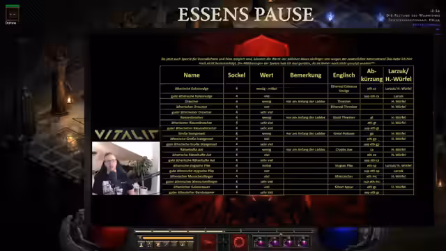 11:32:00Der Streamer verbringt zwölf Stunden am Stück nur mit Farmen im Chaos-Sanctum, was anstrengend ist und zu Augenproblemen führt. Die langen Sessions werden mit früheren Zeiten verglichen, in denen dies als normal galt. Das Fehlen von klassischen, handelbaren Items wie Viper, Harlequin oder Arach wird bedauert, während viele Elite-Uniques gefunden wurden, die aber nicht gebraucht werden. Die Bewertung der Drop-Rate wird auf 7 von 10 herabgesetzt, trotz des Ausrufezeichen-Drops eines sehr seltenen Items.