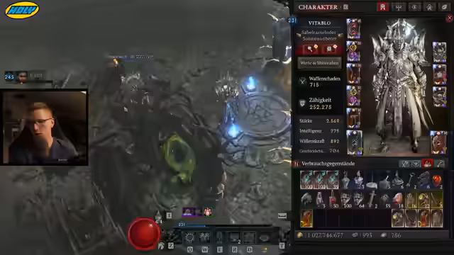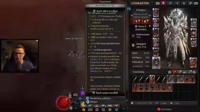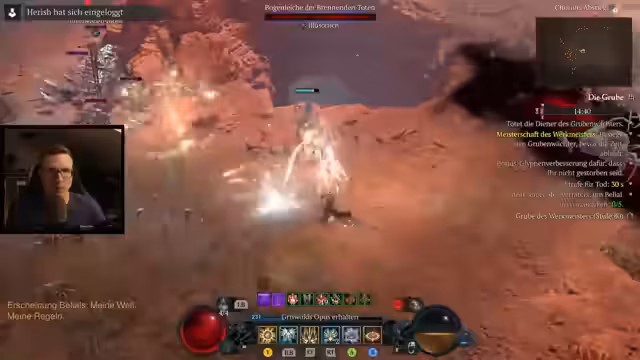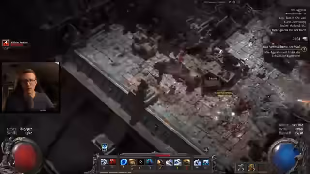 00:44:22Für das Event um 18:00 Uhr werden vier spezifische Materialien (Unique Essenzen) benötigt: Geläuterte Klaue, Auge, Horn und Zunge. Der Streamer plant mit drei weiteren Spielern, die alle vier Materialien besitzen, das Portal viermal zu farmen. Er zeigt seine Ausrüstung: Eine geheiligte Waffe, Ringe mit Attack Speed und Life per Hit, Handschuhe, Hose und Schuhe. Er erwähnt, dass er mit Gebieter-Aspekt spielt, da dieser durch Movespeed und Verwundbarkeit vorteilhaft ist. Die Gruppenkoordination wird vorbereitet, Teilnehmer werden per Chat-Battle-Tag eingeladen.