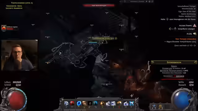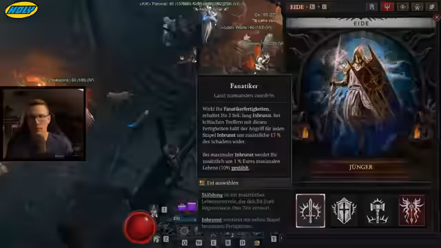 01:45:05Nach Heiligung weiterer Items plant vitablo den Bau eines Eiferparler-Builds. Er entscheidet sich für Eid des Fanatikers als Hauptskill und Gebieter als Ultimate. Wichtige Aspekte wie Fanatiker-Aspekt (zusätzliche Treffer) werden ausgewählt, und er diskutiert die Notwendigkeit von defensive Elementen wie Heilung pro Treffer, da der Build keine Schilder nutzt und somit glasig ist.
