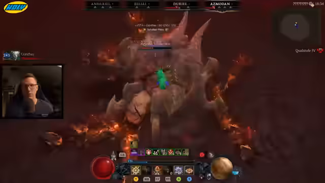 00:58:34Nach Gruppenbildung erklärt der Streamer das Vorgehen: Jeder Spieler legt sein Material an einem bestimmten Altar nieder (Orte werden koordiniert), was ein persönliches Portal öffnet. Die Gruppe portet dann zur Hauptstadt und folgt dem Portalinhaber in die Instanz. Der erste Run mit vier Bossen (Duril, Andariel, Duriel, Asmodan) startet. Die Bosse sind hartnäckig, aber besiegbare. Der Streamer betont, dass das Portal nur für den Materialleger sichtbar ist und die Gruppe über die Hauptstadt joinen muss. Nach dem Sieg wird der erste Loot gesichtet.