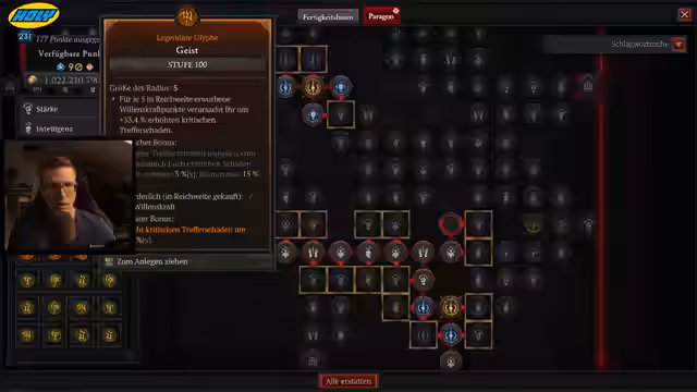02:03:44vitablo optimiert den Paragon-Baum für seinen Build. Er wählt Glyphen wie Herausforderer und Kastell für die erste Tafel, Splitter für Willenskraft und priorisiert defensive Knoten. Diskussionen drehen sich um die Verteilung von Willenskraft und die Effizienz von Glyphen wie Geist. Entscheidungen werden basierend auf Werten wie Angriffsgeschwindigkeit und Schadensreduktion getroffen.