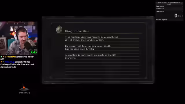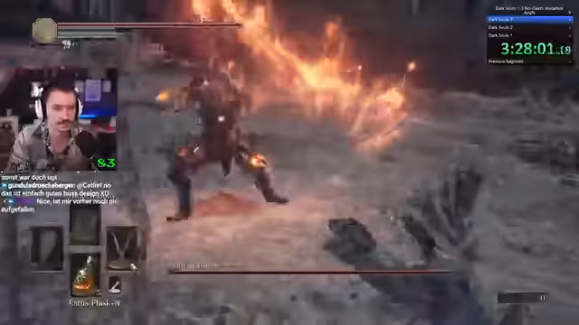 Es wurde ein ambitiöser Versuch gestartet, die gesamte Dark Souls-Serie ohne einen einzigen Tod zu durchspielen. Nachdem die ersten beiden Teile gemeistert wurden, scheiterte der Versuch jedoch im Finale. Der Kampf gegen den Endboss in Dark Souls 1 gestaltete sich als unüberwindbare Hürde, weshalb der Run abgebrochen und ein Neustart für den Folgetag geplant wurde.