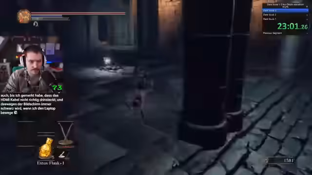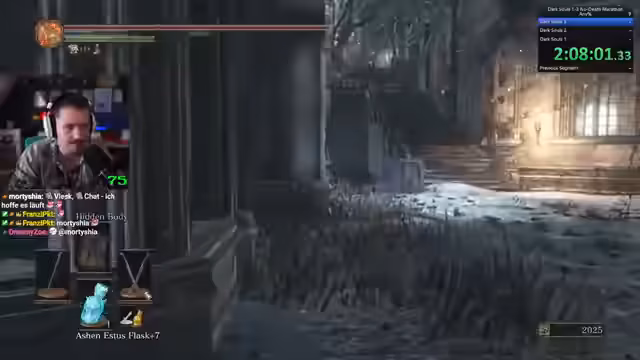 00:20:50Nach einem reinigenden Tempelgang und dem Besorgen einiger Items, darunter eine Feuerbombe, fährt der Streamer im Spiel fort. Er erwähnt seine Sorge, bei einem Boss sterben zu können, da er in den vorherigen Runs viel zu knapp gespielt habe. Sein Vorhaben, den Weg zu den Abyss-Watchers als letztes zu absolvieren und stattdessen Pontiff Sulyvahn als nächsten Boss zu besiegen, wird in Chat vorgeschlagen. Dabei erwähnt er auch seine Unsicherheit bezüglich der Bosskämpfe und seiner Form, da er festgestellt hat, dass er No-Death-Runs vor allem durch Fehler außerhalb von Bosskämpfen verliert.