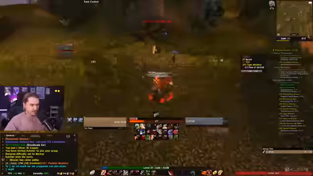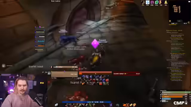 12:07:22Es kommt zu einer organisierten Gruppen-Aktivität im Scharlachroten Kloster. Der Streamer agiert als Tank und beschreibt einen chaotischen Bosskampf, bei dem ein Magier den ersten Biss des Bosses erhält. Er gibt offen zu, sich damals als Retri-Paladin in den Kampf eingemischt zu haben, um den ersten Biss zu erhalten, eine Taktik, die er den anderen nicht verraten hatte. Trotz der unkoordinierten Aktionen war der Kampf erfolgreich.