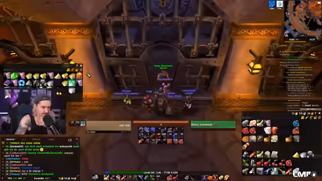 08:31:18Es zeigt sich eine große Hilfsbereitschaft in der Gilde. Der Streamer vermittelt einen Tank für eine Gildenmitglieder-Gruppe, um das Deadmines-Dungeon durchzuführen. Er selbst übernimmt dabei die Rolle eines Mentors. Er verteilt kostenlos 8er-Taschen an Low-Level-Spieler und biete Hilfe an. Gleichzeitig teilt er wichtige Tipps und Strategien für Dungeons wie die Deadmines, wie zum Beispiel den 'Minecart-Spot' als Safe-Zone für Melee-Kämpfe.