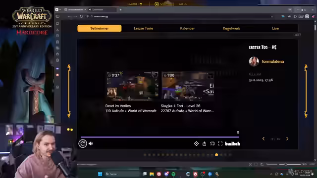 00:03:55Der Stream beginnt mit musikalischer Untermalung. Der Streamer begrüßt das Publikum nach einem Spaziergang im Schnee und möchte direkt in den World of Warcraft-Modus wechseln. Zuerst müssen jedoch Todeseinspieler der vergangenen Tage angeschaut werden, da viele Clips noch nicht gesichtet wurden. Die Einspieler zeigen teils vermeidbare Tode, die aus Panik, Fehleinschätzungen des Levelunterschieds oder mangelndem Wissen über das Ausgangsverhalten in Dungeons resultierten und für Frust sorgten.