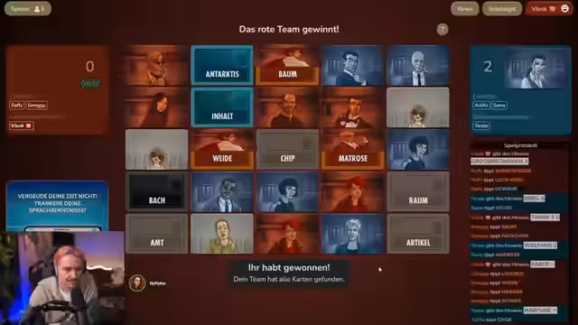 01:30:49Die Streamer diskutieren intensiv über mögliche Wörter für das Spiel Codenames. Es geht um Wörter wie Wurf, Schiff, Bibel, Walfang und Antarktis. Die Teilnehmer überlegen, welche Wörter zueinander passen und wie sie die gegnerischen Teams täuschen können. Es wird über verschiedene Strategien gesprochen, wie man die Wörter am besten verbinden kann und welche Wörter wahrscheinlich nicht zum eigenen Team gehören. Die Runde ist geprägt von schnellen Entscheidungen und manchmal verwirrenden Wortverbindungen.