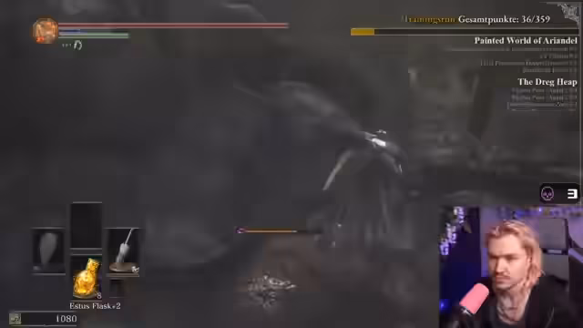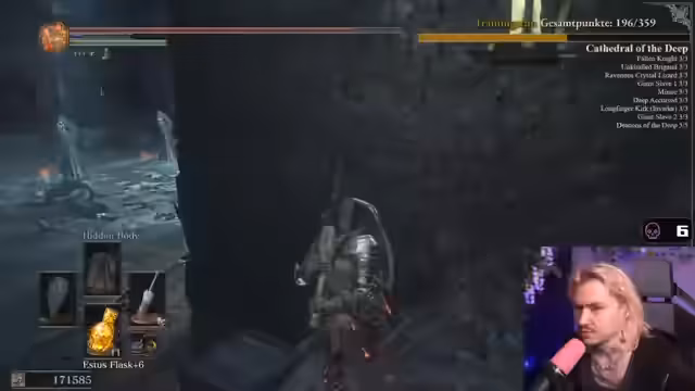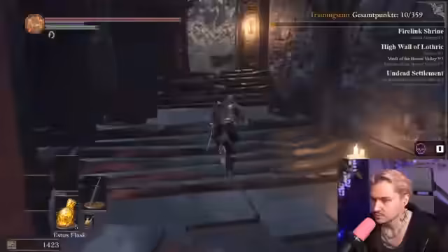 02:47:42Der Streamer sammelt verschiedene Upgrades und Gegenstände wie Titanite Shards und Ring während seiner Reise. Er kämpft gegen Invader wie Holy Night Hordrick und Unkindled Butcher, wobei er strategische Entscheidungen über den Zeitpunkt der Kämpfe trifft, um wichtige Punkte im Spiel nicht zu verpassen.