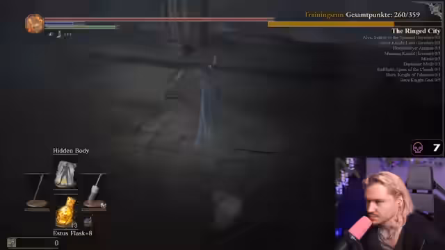 06:52:37Auf dem Weg zum Abschluss des Trainings müssen noch letzte Gegner wie die Dragonslayer Armor und Alva, der Verstoßene, besiegt werden. Der Streamer versucht, effiziente Routen zu finden, um Zeit zu sparen und alle erforderlichen Punkte zu sammeln. Dabei kommt es zu einigen Schwierigkeiten, wie dem Verlust von Leben und das Überqueren von gefährlichen Gebieten, aber er bleibt optimistisch, den Run am nächsten Tag ohne Tode zu meistern.