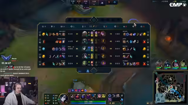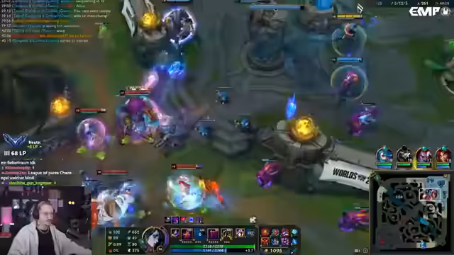 02:15:56Der Streamer erzielt eine beeindruckende Leistung, indem er Jarvan und Quinn eliminiert. Er erklärt, dass die Quinn aufgrund der Jarvan-Ulti nicht angreifen konnte, was ihm ermöglichte, zuerst Jarvan und dann Quinn zu besiegen. Er steht 7-0 und hat einen deutlichen Vorsprung vor der gegnerischen Quinn. Trotz dieser Dominanz kommt es zu Rückschlägen, als er in einem unglücklichen Kampf stirbt und wichtige Stacks verliert. Er reflektiert über die Gefahren des Side-Lanings und die hohe Engage-Fähigkeit des gegnerischen Teams. Die Kaisa wird zu einer Bedrohung, da sie viele Kills sammelt, während der Streamer selbst zu oft stirbt.